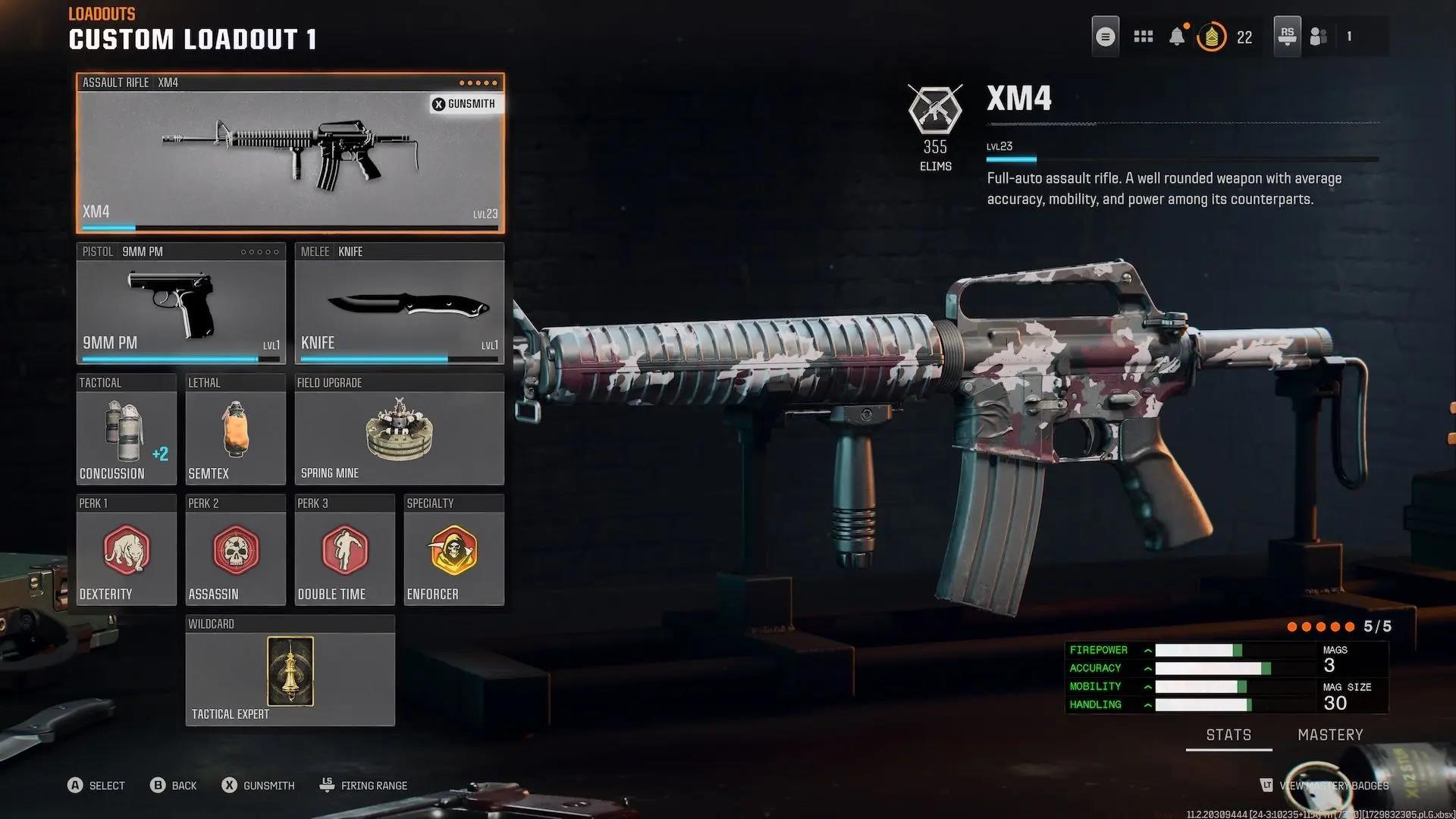- Primary Weapon: XM4 assault rifle (consistent damage output with controllable recoil patterns)