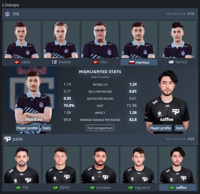 - Compare key player statistics using HLTV.org or scope.gg comparison tools