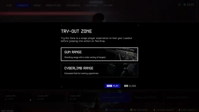 - Navigate to Loadouts from main menu and access Try-out Zone