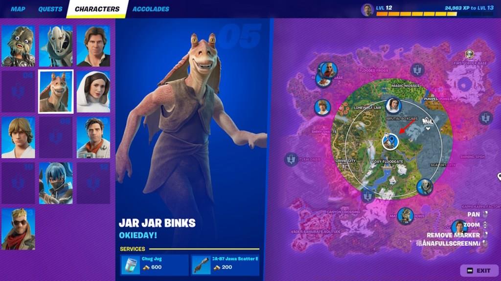2TL;DR Jar Jar Binks spawns between Foxy Floodgate and Brutal Boxcars near a riverside shack Complete four sequential tasks: fishing, outpost delivery, ground spraying, and return E...