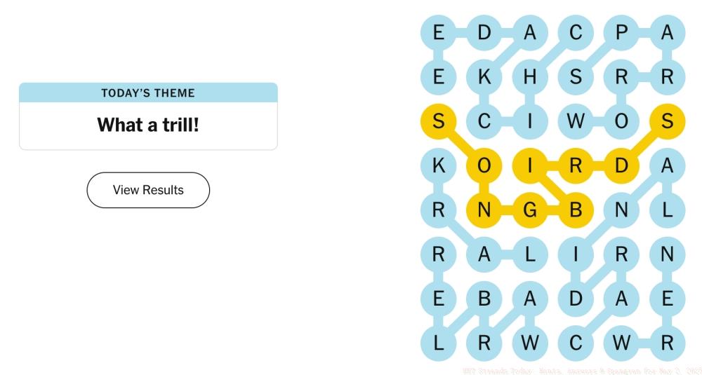 1TL;DR Today’s Strands theme “What a trill!” focuses on birds known for their distinctive vocalizations The horizontal Spangram begins with “SO” and co...