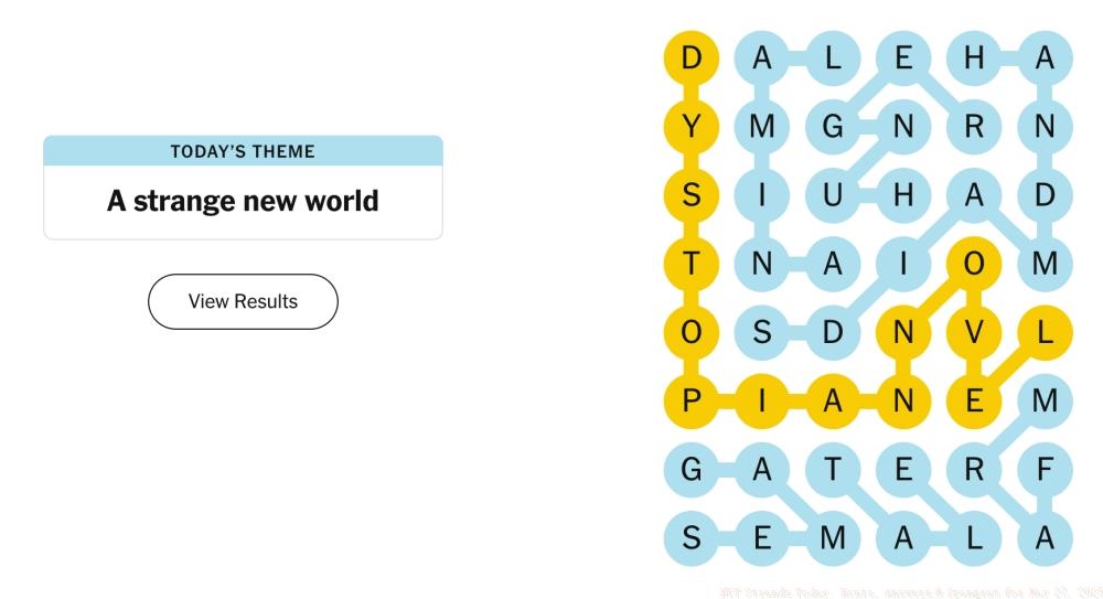 1TL;DR Today’s Strands theme “A Strange New World” focuses on dystopian literature concepts The Spangram runs horizontally starting with “DY” and conne...