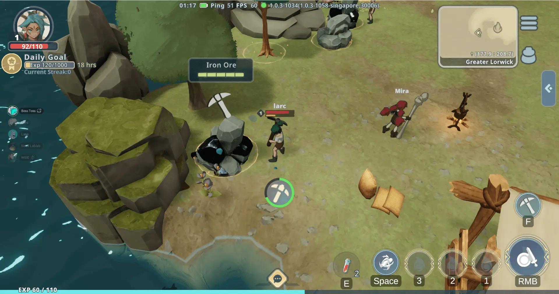 - Mine iron ore efficiently using your starter pickaxe near town within 30 seconds