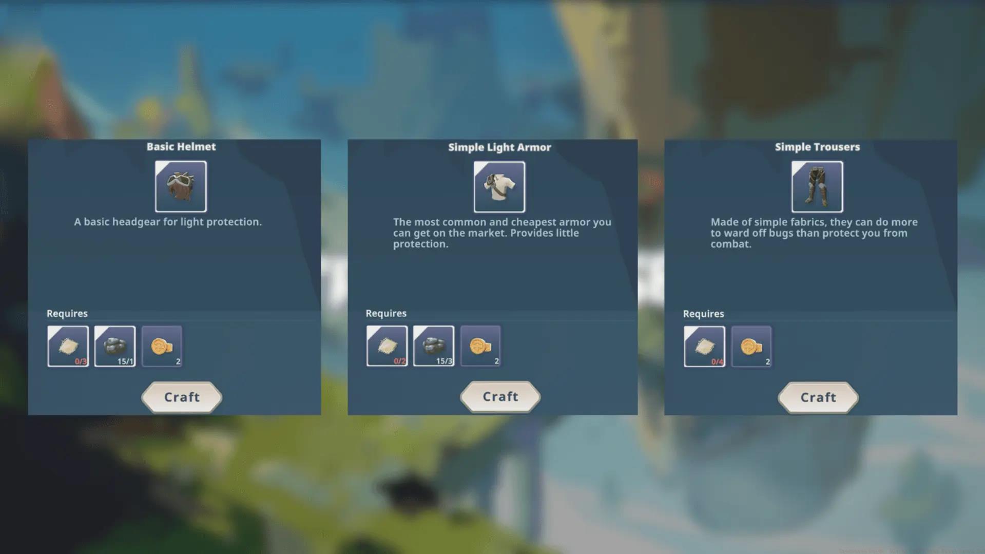 - Reach Level 2 before crafting and gather specific material quantities for each armor piece