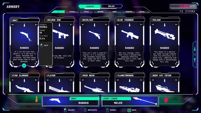 Every character maintains two weapon slots: one for ranged combat and another for melee engagements. These selections fundamentally shape your combat approach and tactical options throughout each run.